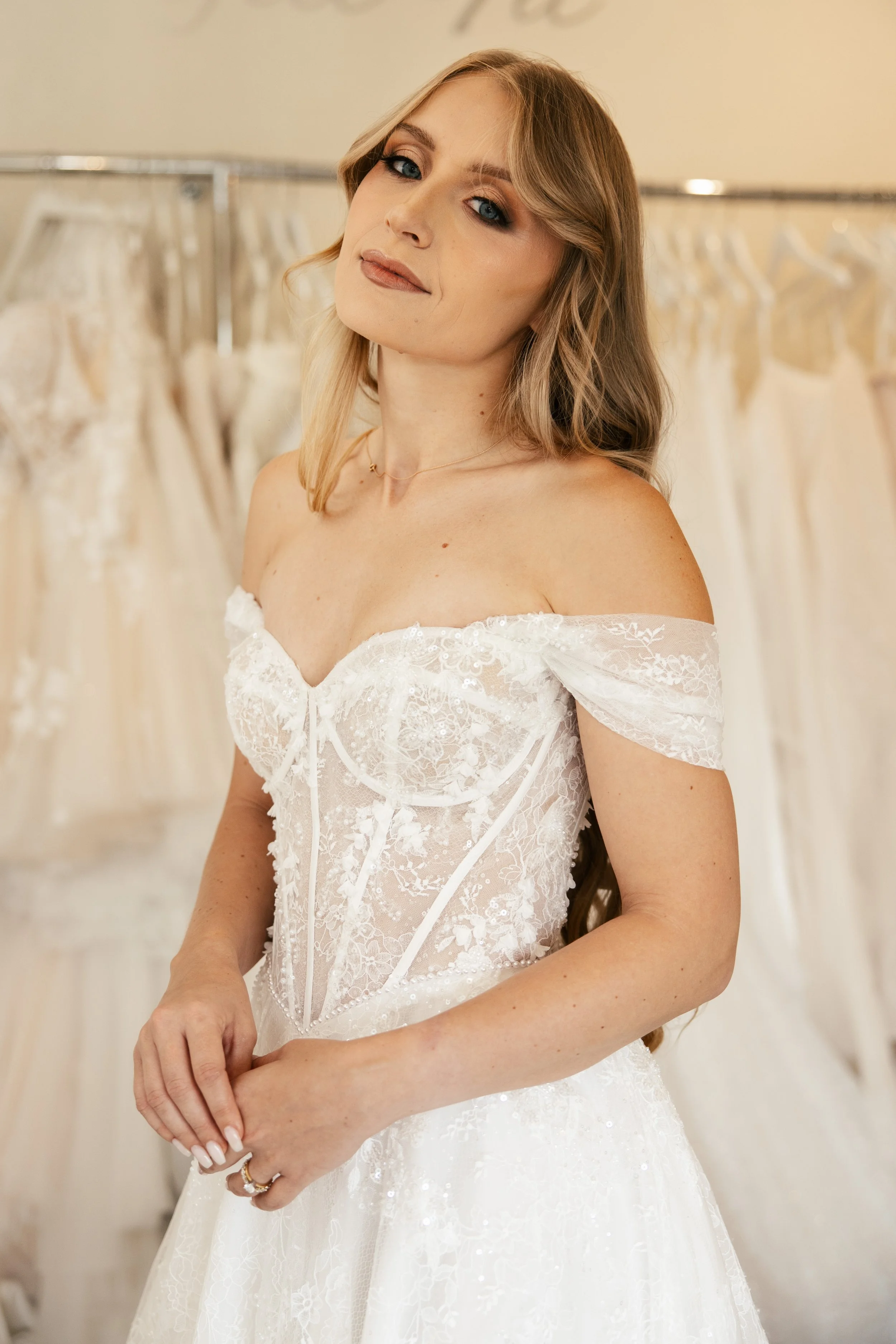 Featuring this season’s most sought-after trends — Basque waist wedding dresses, Chantilly lace bridal gowns, modern Mikado ball gowns, and chic two-piece wedding dresses — each gown is crafted with intentional detail and exceptional structure.